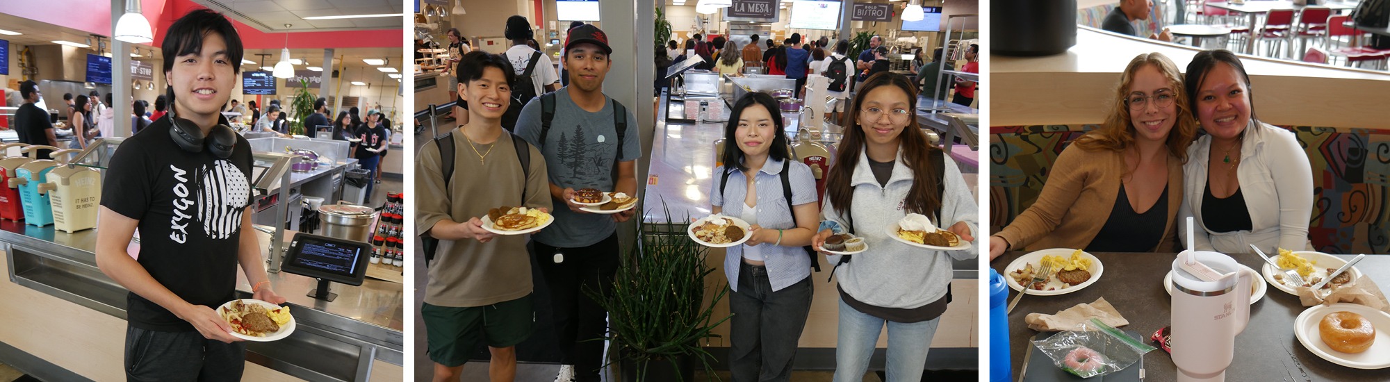 Students had breakfast options for dinner, including vegan items like pancakes, roasted breakfast potatoes, and Beyond Meat plant-based sausage patties. Other available items were scrambled eggs, farro peach hot cereal, sausage patties, and French fries. Desserts like cake and pancake toppings were also provided.