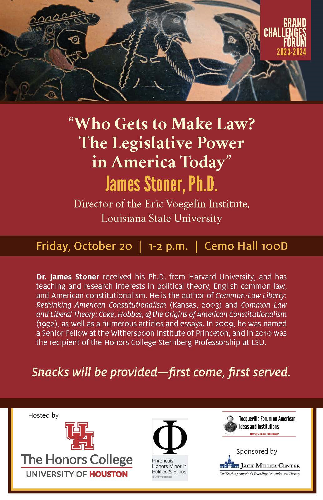 James R. Stoner, Jr., Hermann Moyse, Jr. Professor and Director of the Eric Voegelin Institute for American Renaissance Studies at Louisiana State University, Department of Political Science, conducted a seminar titled "When Robert Oppenheimer Met Eric Voegelin: On Science, Communism, and the End of the World", and gave a public lecture in CEMO Hall, "Who Gets to Make Law? The Legislative Power Today". Flyers and Photos